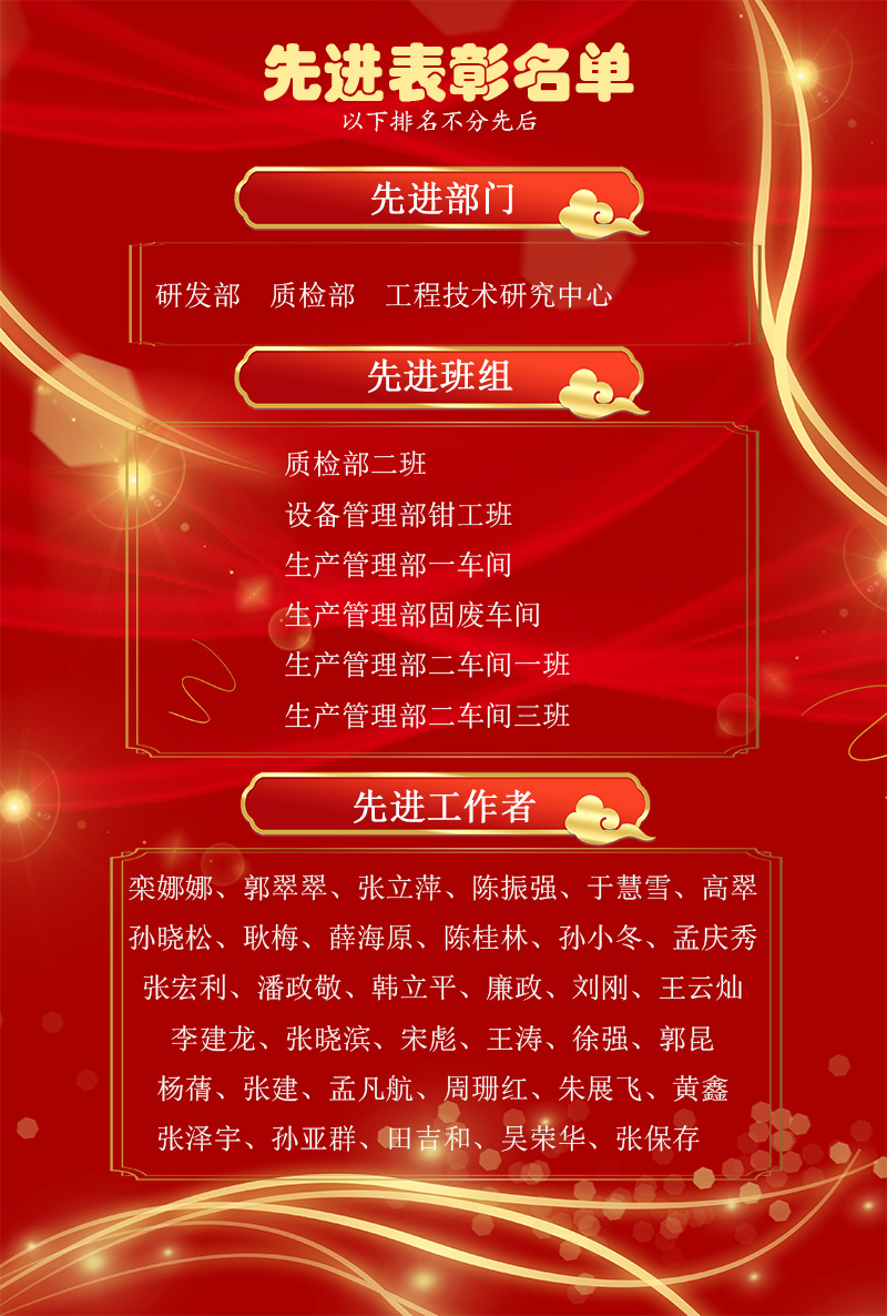 為表彰先進,樹立楷模,1月24日下午,公司2021年度先進表彰儀式在研發(fā)中心會議室隆重舉行,儀式現場對先進工作者、先進班組、先進部門進行表彰嘉獎。公司董事長、總經理張新功,公司各級經營管理干部及先進工作者、先進班組及部門代表參加了儀式。
