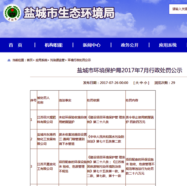 鹽城市環(huán)境保護(hù)局2017年7月行政處罰公示顯示,江蘇天嘉宜化工有限公司存在項(xiàng)目配套的環(huán)保設(shè)施未驗(yàn)收、危廢管理不規(guī)范等違法行為,處罰款28萬元。