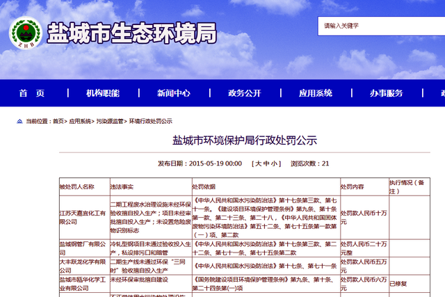 鹽城市環(huán)境保護(hù)局2015年5月19日公布的行政處罰公示顯示,江蘇天嘉宜化工有限公司二期工程廢水治理設(shè)施未經(jīng)環(huán)保驗(yàn)收擅自投入生產(chǎn);未設(shè)置危險(xiǎn)廢物識別標(biāo)志,處罰款人民幣10萬元。