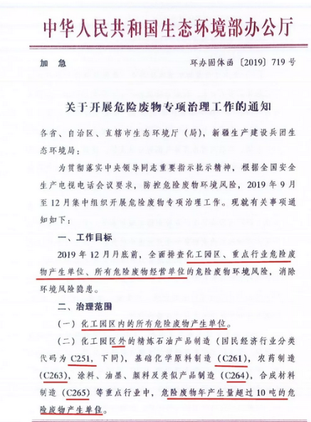 日前生態(tài)環(huán)境部印發(fā)加急文件《關于開展危險廢物專項治理工作的通知》。 《通知》要求今年年底前,在全國范圍內(nèi)排查化工園區(qū)、重點行業(yè)危險廢物產(chǎn)生單位、所有危險廢物經(jīng)營單位的危險廢物環(huán)境風險,消除環(huán)境風險隱患。[ 查看更多 ]